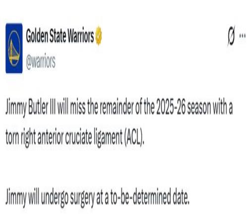 北京时间1月21日,勇士官方发布声明,前锋吉米-巴特勒因右膝前交叉韧带撕裂,将缺席2025-26赛季的剩余所有比赛。巴特勒是在昨日对阵迈阿密热火的比赛第三节还剩7分41秒时受伤的,勇士队最终以135-112获胜。他将在择期接受手术。
