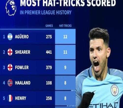 德转统计英超历史戴帽次数前10:阿圭罗12次第1,哈兰德第4 -